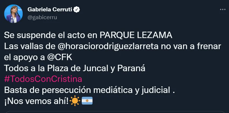 Gabriela Cerruti, vocera presidencial, también se sumó a la invitación de Juan Grabois y convocó a la militancia vía Twitter a manifestarse en la intersección de Uruguay y Montevideo.