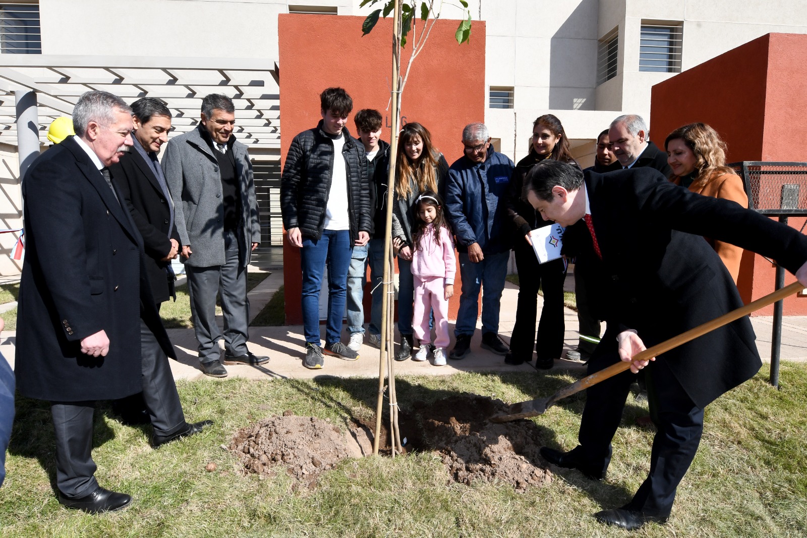 Antes del corte de cintas y en el marco de la campaña de arbolado que lleva a cabo la provincia con la comuna capitalina, el gobernador plantó un lapacho junto con Ángela Sánchez Ocampo y sus hijos, la familia en cuya vivienda se hizo la ceremonia inaugural y el recorrido por la unidad habitacional que cuenta con todos los servicios básicos, como cloaca, gas natural y red eléctrica.