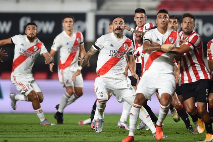 A los 8, Manuel Castro tuvo la más clara de Estudiantes en la primera mitad, cuando sacó un remate desde afuera del área, que se desvió en el recorrido y exigió a Franco Armani. Los de Núñez tuvieron algunas ocasiones de peligro por intermedio de Borré y Suárez, pero sin éxito. Sobre el final de la primera mitad, Tobio fue a disputar una pelota con Casco con la pierna demasiado arriba y se fue expulsado.