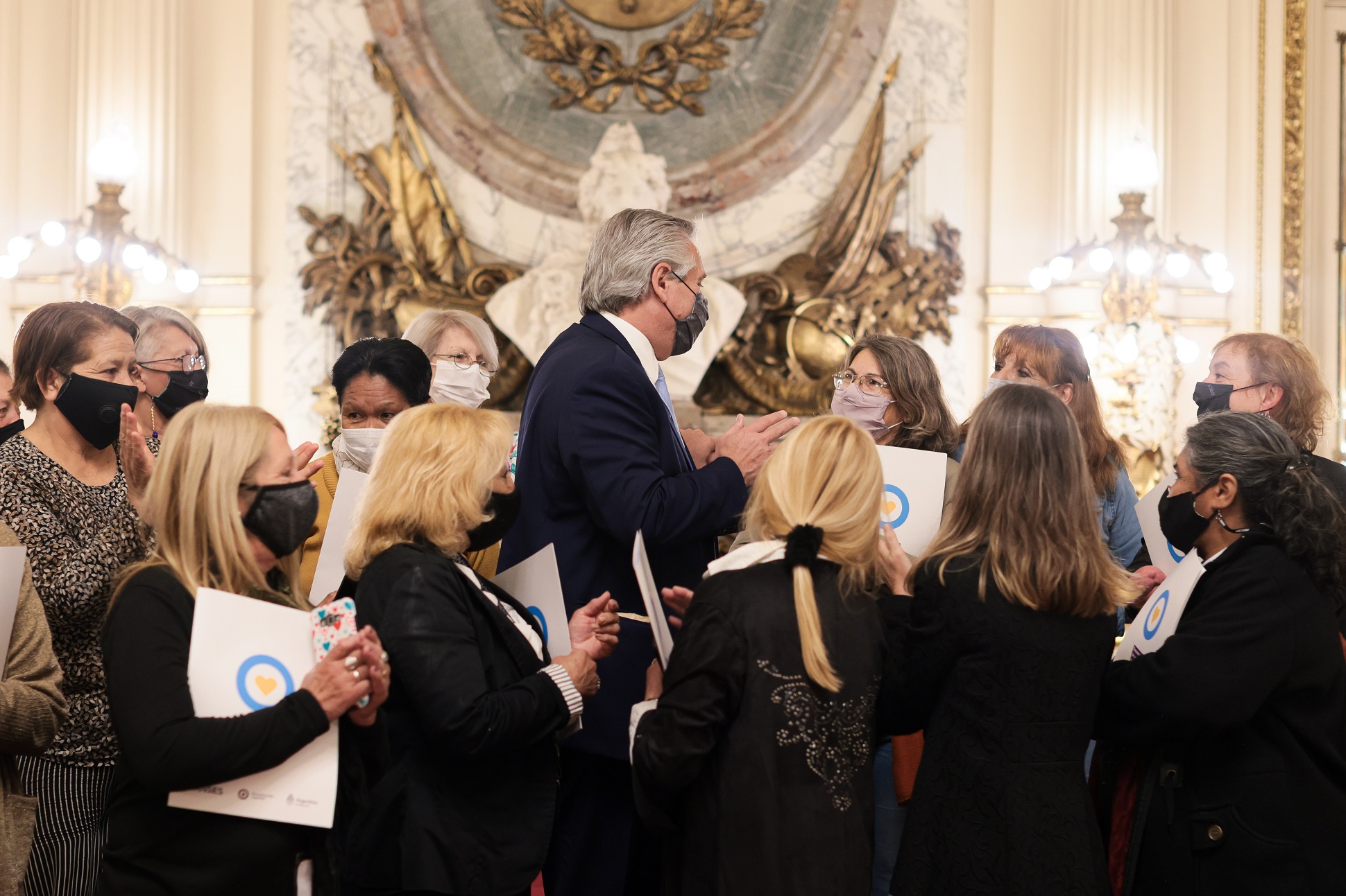 El presidente Alberto Fernández saludó esta tarde a las primeras beneficiarias de las jubilaciones por Reconocimiento de Aportes de Tareas de Cuidado, en el Salón Sur de la Casa Rosada, luego de que recibieran dicho reconocimiento por parte del jefe de Gabinete, Juan Manzur y la directora Ejecutiva de la Anses, Fernanda Raverta.