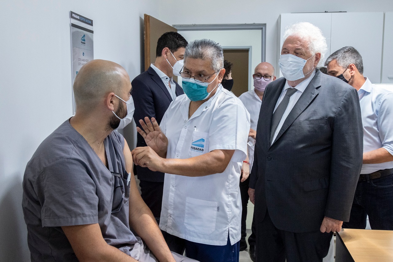 El ministro de Salud de la Nación, Ginés González García, supervisó hoy en el Hospital Posadas la aplicación de la segunda dosis de la vacuna Sputnik V contra la COVID-19 en el personal de salud que recibió la primera hace 21 días, plazo mínimo que debe haber entre dosis.