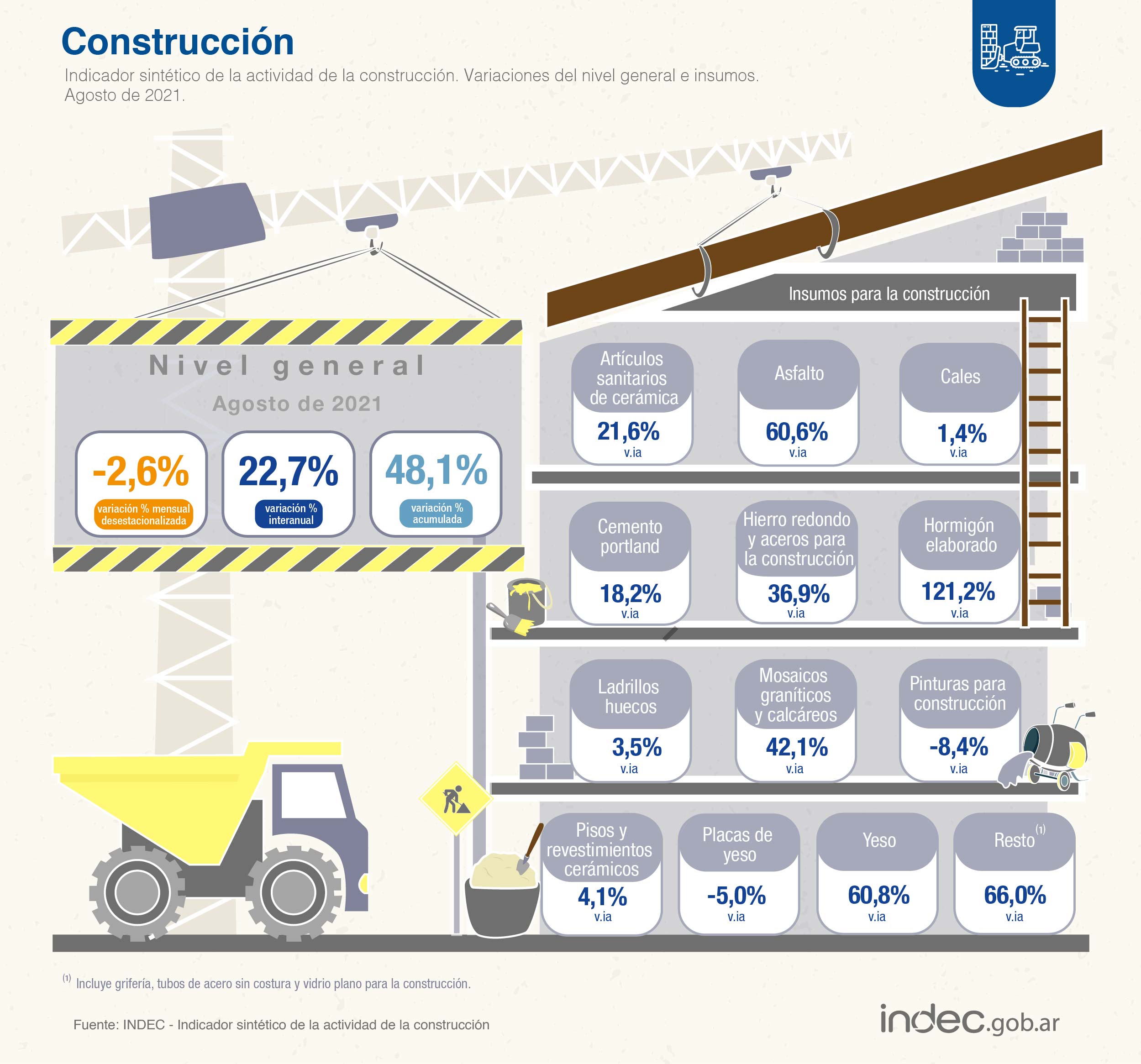 El nivel de actividad de la industria registró en agosto un incremento de 13,8% respecto de igual mes de 2020 y el indicador sintético de la construcción marcó una suba de 22,7%, informó hoy el Instituto Nacional de Estadística y Censos (Indec).