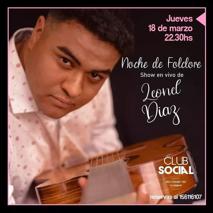 22:30 hs. LIONEL DIAZ “Noche de Folclore” en el Club Social, Av. Belgrano 169, La Banda.