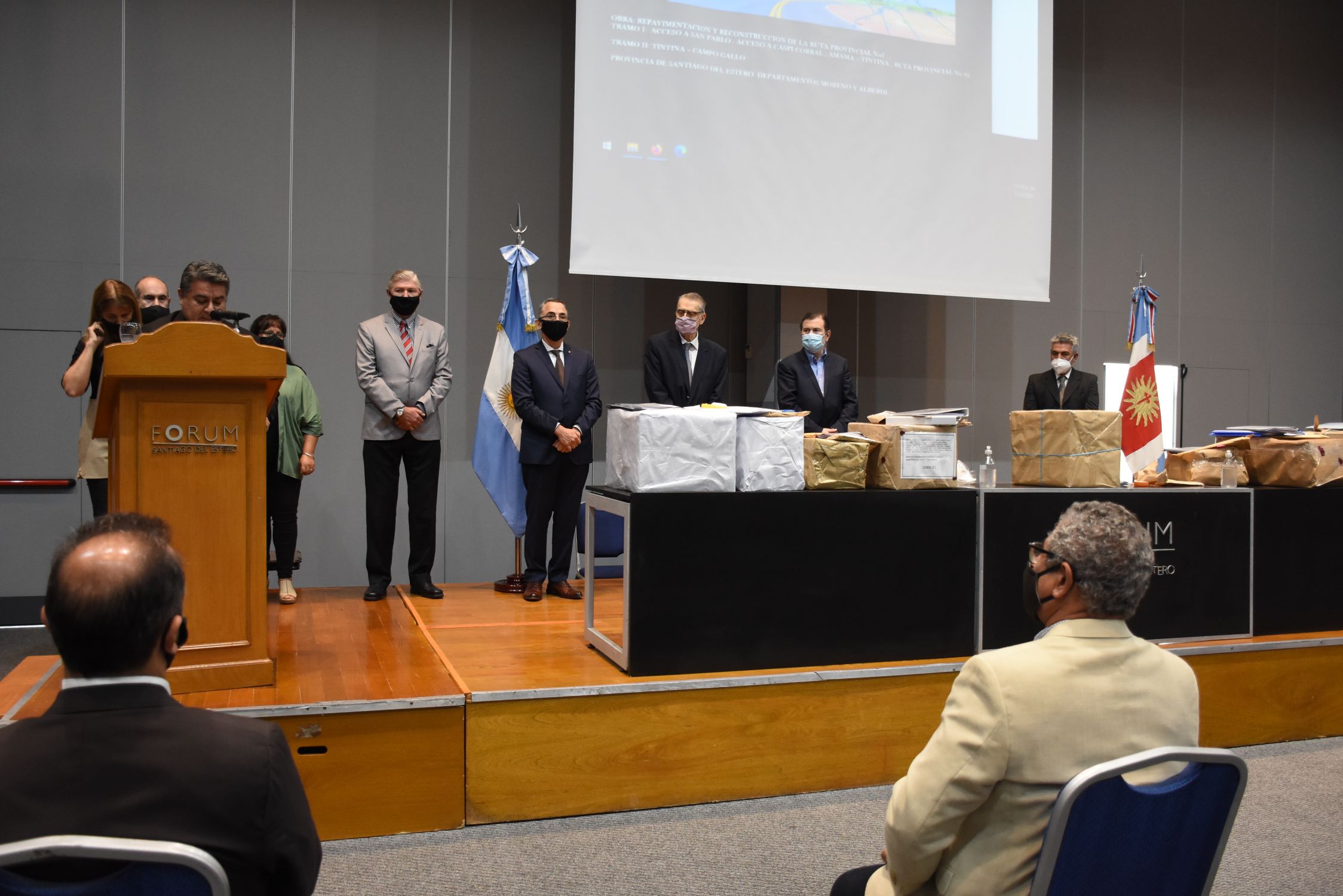 El acto estuvo encabezado por el Gobernador de la provincia, Dr. Gerardo Zamora acompañado por el ministro de Obras Públicas, Agua y Medio Ambiente, Arq. Argentino Cambrini, presidente del Consejo Provincial de Vialidad de la provincia, Ing. José Alfano, Jefe del distrito N° 16 de Vialidad de la Nación, Ing. Carlos Ferreyro, Escribana de Gobierno, María Virginia Viaña . También acompañaron los Intendentes de Campo Gallo, José Vittar, de Tintina, Luis Gonzales y los comisionados de Amamá, Nicolás Salvatierra, comisionada de Donadeu, Virginia Ibarra , comisionado de Granadero Gatica, José Rodríguez y comisionado de Libertad, Ramón Coria. Asimismo, los diputados provinciales Amado Chamorro y Mario Cantoni y los representantes de las ocho empresas oferentes.